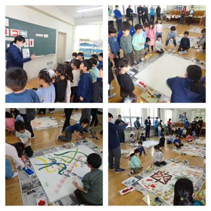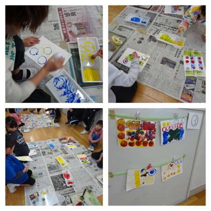 本日は研究の日でした。1年2組で単元名『ぺったん コロコロ』の学習をしました。さまざまな材料に絵の具をつけて、スタンプのように『ぺったん』したり、ローラーに絵の具をつけて『コロコロ』と転がして色をぬったりして、できた形を楽しみました。「もっとああしてみよう。こうしてみよう!」と一人一人が意欲的に取り組んでいました。一人で色々試して個人作品をつくった後に、グループで大きな紙に協働作品をつくりました。大きな紙に思いっきり大胆に、体全体をつかって表現できました。みんなとっても楽しそうに活動できました。