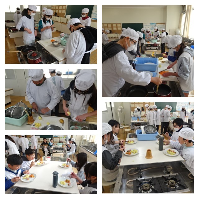 今日は6年1組と3組が調理実習をしました。『ゆでたり炒めたりしておかずをつくろう』ということで、『こふきいも』と『野菜のベーコン巻き焼き』を作りました。ベーコンに巻ける大きさに野菜を切ったり、ゆでる順番を考えたりして、みんなで役割分担もしながら協力して作っていました。できた料理はみんなでおいしそうに楽しく食べていました。最後片付けまでしっかりと協力して、さすが6年生という動きでした。