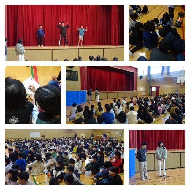 本日の児童集会は、『先生声あてゲーム』でした。先生と委員会の子どもが声を変えて同じセリフを隠れた場所で言って、3択のクイズ形式で行うというものでした。子ども達は大盛り上がりで楽しんでいました。「☆番の声が先生だと思うけど、〇〇先生かな?□□先生かな?」という感じで迷っている子が多かったです。