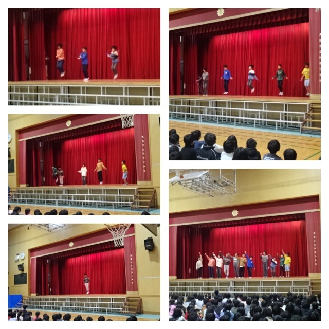 本日の児童朝会では、運動委員会より『なわとびの技紹介』の発表がありました。様々ななわとびの技を実際に跳んで見せて、紹介しました。特に低学年の子ども達からは、自分ができない技を多く見ることができ、「すごいー!」と歓声が上がっていました。今週は運動委員会の子ども達が休み時間に運動場で一緒に縄跳びをする活動をします。一緒になわとびをして、できる技を増やしたり、なわとびの楽しさを感じたりできるといいなと思います。