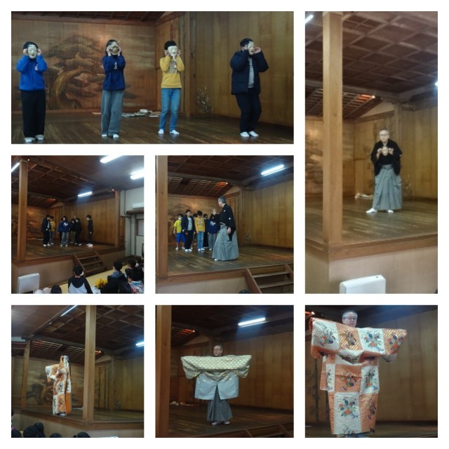 学校のお隣にある九皐会館に招待していただき、5年生は能楽について学びました。能や狂言に使用される能舞台に実際に立たせていただき、お面もつけて能楽体験を行いました。能楽の歴史も学びました。