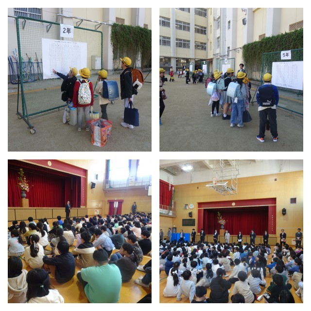 運動場でのクラス・担任発表の後、始業式を行いました。新しく来られた先生方の紹介のあと、改めて担任発表を行いました。子ども達は、ワクワクドキドキした様子で、新年度がんばろうという気持ちも伝わってきました。いよいよ全員そろっての新年度がスタートしました。