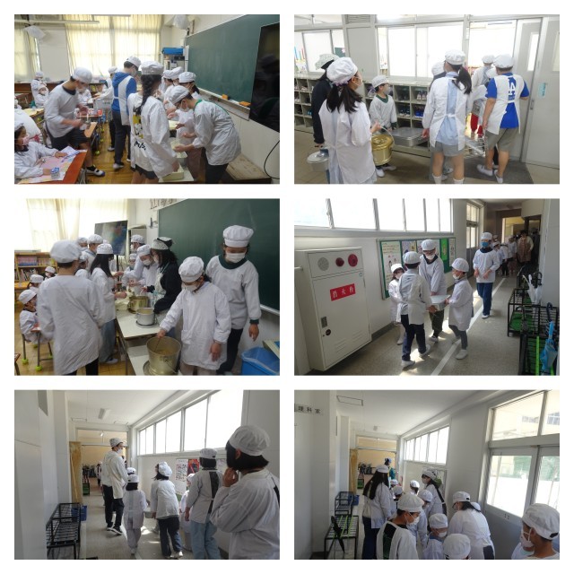 入学した1年生の給食の準備を、いつも6年生が手伝って、お兄さん・お姉さんぶりを発揮しています。いよいよ1年生が給食を運ぶ練習に入りました。ここでも6年生が、優しく寄り添って運び方を教えています。来週からはいよいよ配膳にも挑戦していきます。