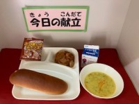 ●豚肉の香味焼き●カレースープ●カリフラワーとコーンのサラダ●おさつパン●牛乳