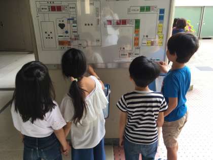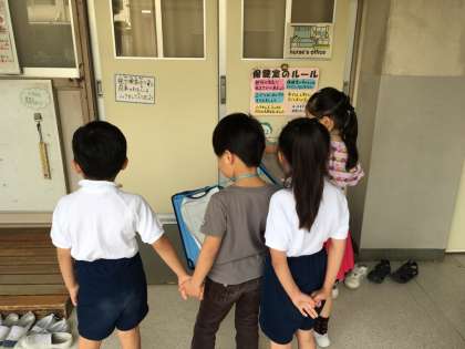 1年生の手を優しく引きながら「ここが〇〇〇です。〇〇のときに使います。」と、丁寧に説明している姿が印象的でした。