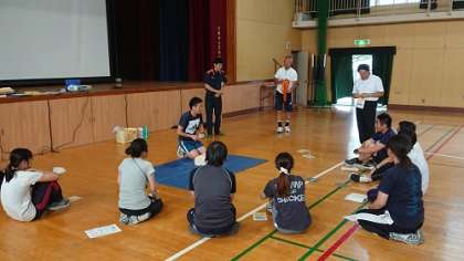 安全なプール水泳学習を行うための大切な研修です。AEDの必要性や心肺蘇生の手順について講義を受けた後、AEDを使用した心肺蘇生の実技を一人一人行いました。
