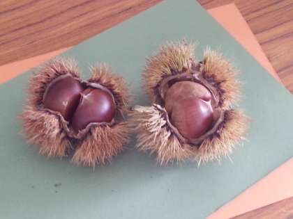 保護者の方から、いがにくるまれた栗をいただきました。子どもたちに見せてあげてくださいとのことでした。玄関に展示していると恐る恐る触ってみた子の「痛い痛い」という悲鳴が聞こえてきました。