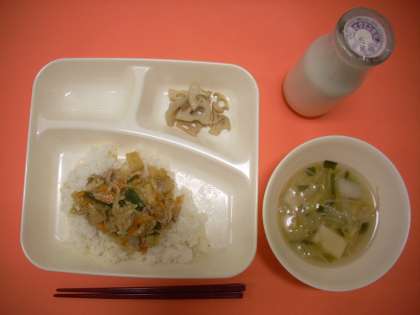ピリ辛丼・ワンタンの皮のスープ・れんこんのオイスターソス焼き・牛乳