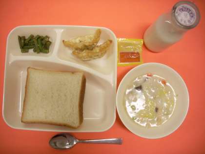 はくさいのクリーム煮・あげギョーザ・中華あえ・食パン・アプリコットジャム・牛乳