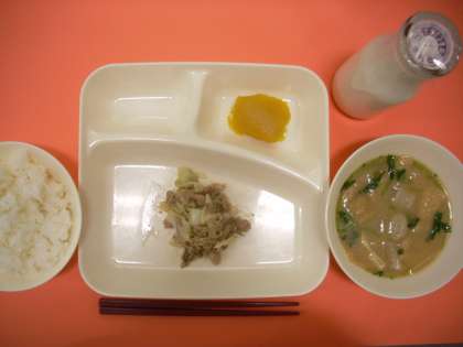 豚肉とまいたけのいためもの・つみれ汁・かぼちゃういろう・ごはん・牛乳