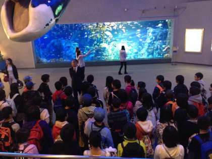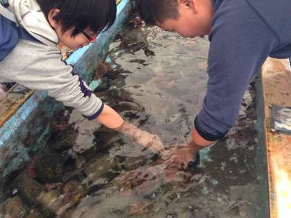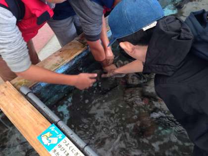 正面の大きな水槽前からグループに分かれて見学です。触れる水槽ではタコ・マアナゴ・ウニを触って大はしゃぎです。