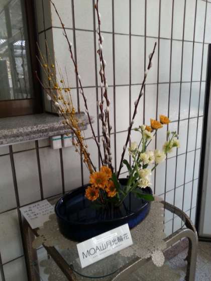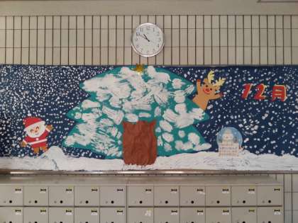 玄関の花があたらしくなりました。また、玄関掲示は今月は1年生が担当し作成しました。液体粘土を使った作品だそうです。