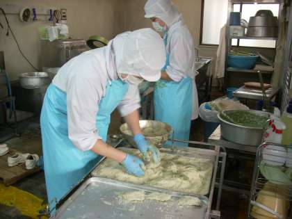 今日のまぐろのいそ風味フライは、学校でまぐろに青のりの入った衣、パン粉をつけて油で揚げました。