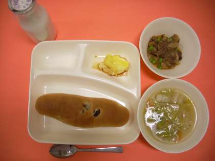 牛肉のデミグラスソース煮・はくさいのスープ・焼きプリン・レーズンパン・牛乳