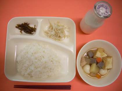 関東煮、もやしのゆず風味、茎わかめのつくだ煮、ごはん、牛乳