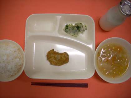 タンドリーチキン、スープ、だいこんサラダ、ごはん、牛乳