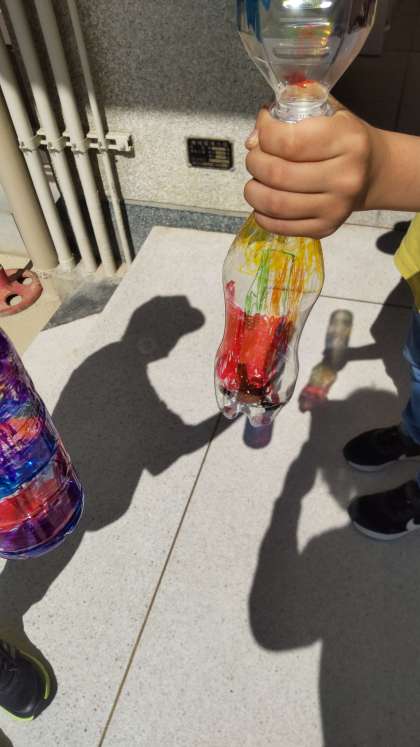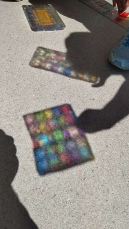 そして、彩られた容器を光にかざすと…。「わぁ!きれい!」「見て見て、ここにも映ったよ。」子どもたちの明るい歓声が聞こえてきました。