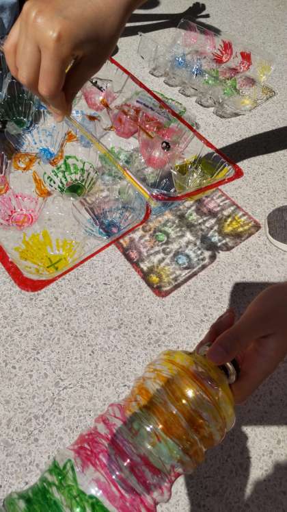 透明の空き容器に、ペンで色をぬりました。「わたしは赤が好きだから、ぬってみたよ。」「しましま模様にぬってみよう。」「半分ずつ色を変えてぬってみよう。」それぞれの透明な空き容器が、明るくカラフルになりました。