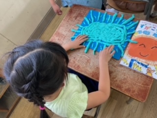 1年生では、図画工作科で「ひもひもねんど」を学習しました。粘土を細長く伸ばし、うずまきをつくったり、長い道にしたり、いろいろな作品が出来上がりました。出来上がった後、みんなで見せ合い楽しみました。