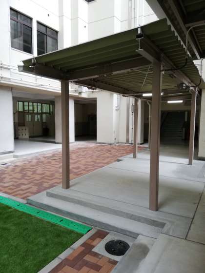建築中だった1階の渡り廊下が完成しました。いきいき教室へのお迎えなど、玄関から新校舎の方へ行かれる場合は、こちらをご利用ください。