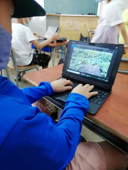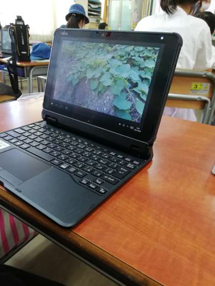秋になりサツマイモの収穫が迫ってきました。子どもたちは、生活科の学習でさつまいもを観察しています。その記録をするために2年生では、一人一台のタブレットを活用しています。子どもたちは教室でスムーズにタブレットを立ち上げて、学習園でさつまいもの葉や茎を撮影し、教室で細かい所をじっくり見ていました。