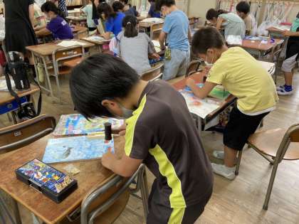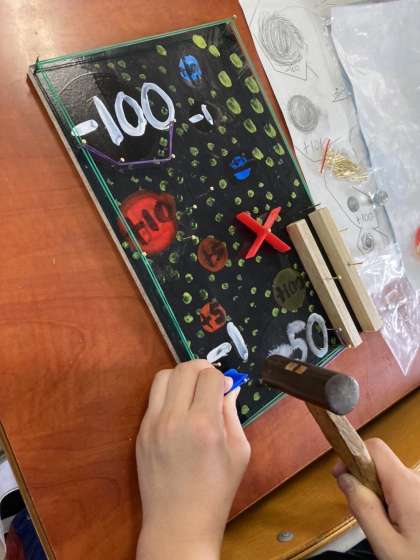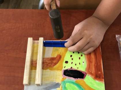 図画工作科「くぎうちゲーム」の製作途中の様子です。3年生では、金づちを初めて使い、くぎを打ちます。指を打たないように気を付けながら集中してがんばっています。