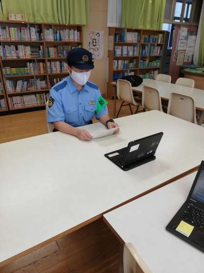 今日の朝は、天王寺警察署の方に来ていただき、自分たちの安全を守るためのお話をしていただきました。途中、通信状態が悪くなり、画面を見ることのできない学級もあったようですが、お話はしっかりと聞くことができていました。