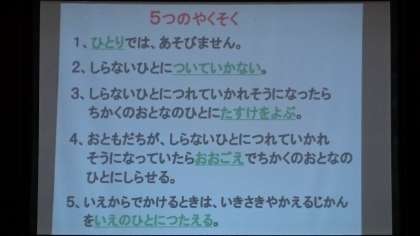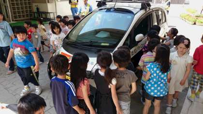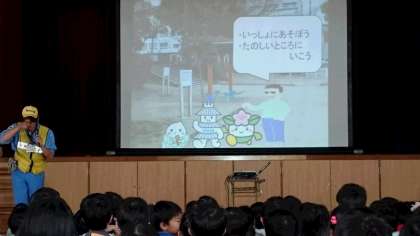 本日(5月1日・金曜日)2時間目に、1年を対象に安全教室を行いました。区役所と天王寺警察から担当の方が来ていただきました。天王寺区のマスコットキャラクターたちが登場する紙芝居風のお話でした。区役所の安全パトロールの方々や五条小学校の見守り隊の方々も写真で紹介していただきました。子どもたちは「知ってる〜。」「○○にいてる〜。」などと興味津々に見入っていました。青パトと呼ばれる電気自動車も講堂前に停めていただきクラスごとに見せていただきました。ご家庭におかれましてもゴールデンウィークが始まりますので、お子様の安全ついてご留意いただきますようお願いします。