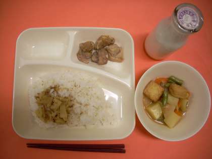 鶏肉のさんしょう焼き、じゃがいもとあつあげの煮もの、ごまかかいため、ごはん、牛乳
