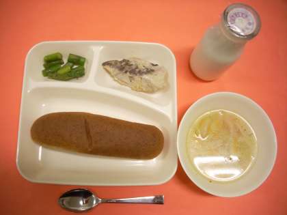 かつおのガーリックマヨネーズ焼き、スープ、グリーンアスパラガスのソテー、ライ麦パン、牛乳