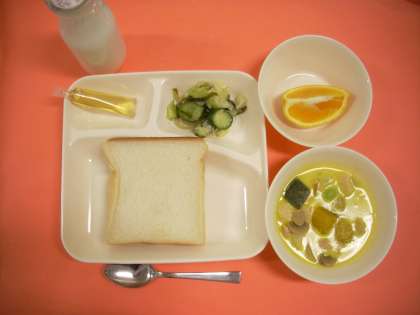 かぼちゃのクリームシチュー、ミックス海そうサラダ、オレンジ、食パン、はちみつ、牛乳