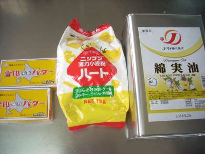 旬のかぼちゃを使ったクリームシチューです。給食では、バターとサラダ油、小麦粉でホワイトルウを作ってとろみとつけました。3枚目の写真がルウを作っているところです。