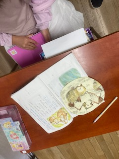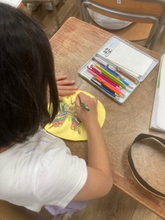 2年生が音読発表会の準備をしていました。自分の役割のお面に色を塗っていました。完成したお面をさっそく頭につけていました。