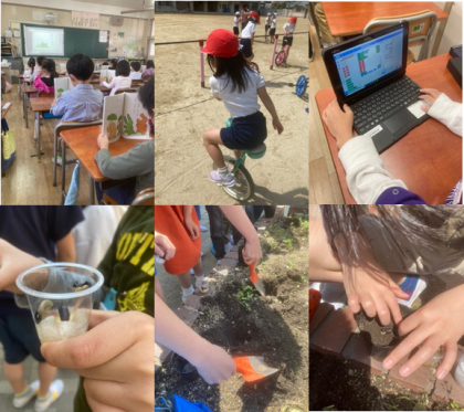 国語の音読や体育での一輪車、プログラミングを使っての算数の学習、実験で発芽したインゲン豆の植え替えなど様々な活動をしていました。
