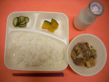 すき焼き煮、きゅうりの酢のもの、焼きかぼちゃの甘みつかけ、ごはん、牛乳