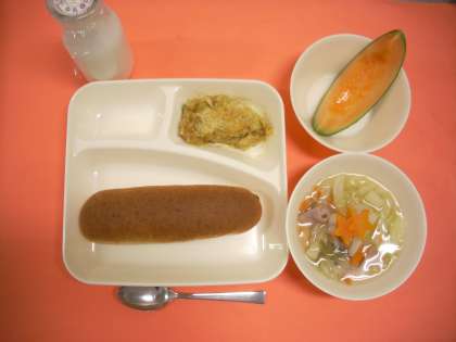 カレードリア、キャベツのスープ、クインシーメロン、ライ麦パン、牛乳
