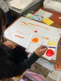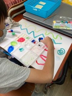 絵の具を使って、色を混ぜたり水の量を変えたりして、いろいろな色を作る学習をしていました。「きれいな色ができた」「こんな色になったよ」「黒を混ぜたらどうなるかな」などいろいろな声があがっていました。