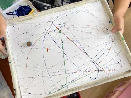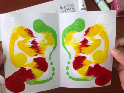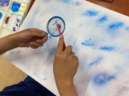 図画工作科「絵の具でゆめもよう」の学習の様子です。スパッタリングやドリッピング、デカルコマニー等の技法を用いて色鮮やかな模様を作っています。偶然できた様々な模様を組み合わせ、コラージュ作品に仕上げていく予定です。