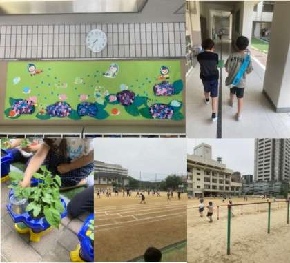 今日から6月です。1学期も折り返し地点を過ぎました。学校では日曜日の体育発表会の練習が大詰めを迎えています。また休み時間には、あさがおやミニトマトの水やり、委員会活動、外遊びなど活発に活動しています。