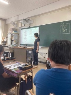 4年生が毛筆習字で「左右」という字を書いていました。一度自分で書いた文字を手本と見比べて、気付いたことを発表しあい、次の作品にいかしていました。