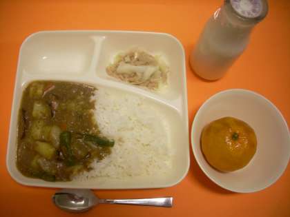牛挽肉と夏野菜のカレーライス、ツナと野菜のマヨネーズいため、冷凍みかん、牛乳