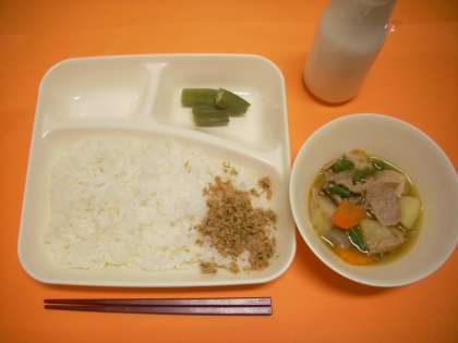 豚肉とじゃがいもの煮もの、オクラの甘酢あえ、紅ざけそぼろ、ごはん、牛乳