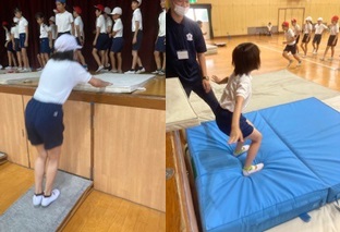 5年生が体育科でとびばこの学習に取り組んでします。舞台を使って「抱え込みとび」の跳びあがり方、「台上前転」の着地の仕方を練習しました。練習を重ねるごとに、体の動かし方を習得する子どもが増えてきました。
