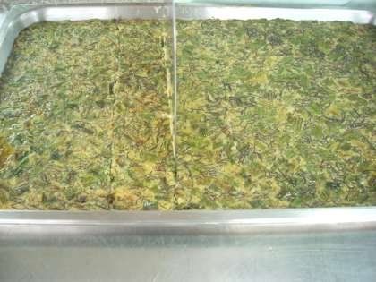 もずく入りヒラヤーチーは、平成24年度学校給食献立調理検討会議で検討、開発された献立です。沖縄県の家庭料理のひとつです。平焼き(平たく焼く)のことを沖縄県の方言で「ヒラヤーチー」といいます。小麦粉、鶏卵、水、様々な具を混ぜ合わせ、名前の通り平たく焼いた料理です。お好み焼きより薄い仕上がりです。2枚目の写真が焼きあがったヒラヤーチーを切り分けているところです。