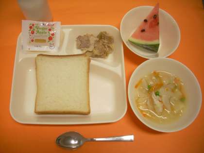 豚肉のカレー風味焼き、じゃがいものスープ、すいか、食パン、りんごジャム、牛乳