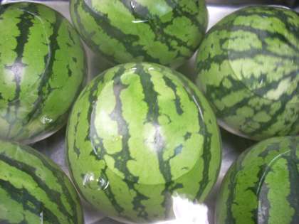ますは、すいかを8等分にします。次に8等分にしたすいかをすべてに角ができるように斜めに包丁を入れながら8つずつに切り分けました。これで、1玉のすいかから64人分のすいかができあがります。