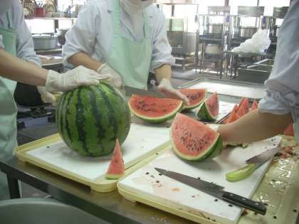 今日は、1玉6.8kgあるすいかを13玉給食室で切り分けました。