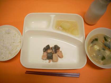 さけのつけ焼き、みそ汁、とうがんの煮もの、ごはん、牛乳