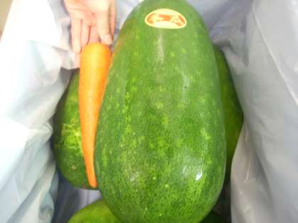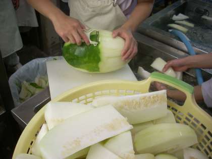 今日のとうがんは、大きいもので5kgありました。皮をむいて、種をとって切りました。
