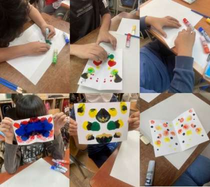 5年生ではいろいろな技法を使って、鳥の羽根を描く予定です。今日はその練習として、二つ折りにした紙に絵の具をつけて、写しとることでできる模様を楽しむ活動をしました。二つ折りにした紙を広げると、自分が想像していなかった模様ができた子もいたようです。